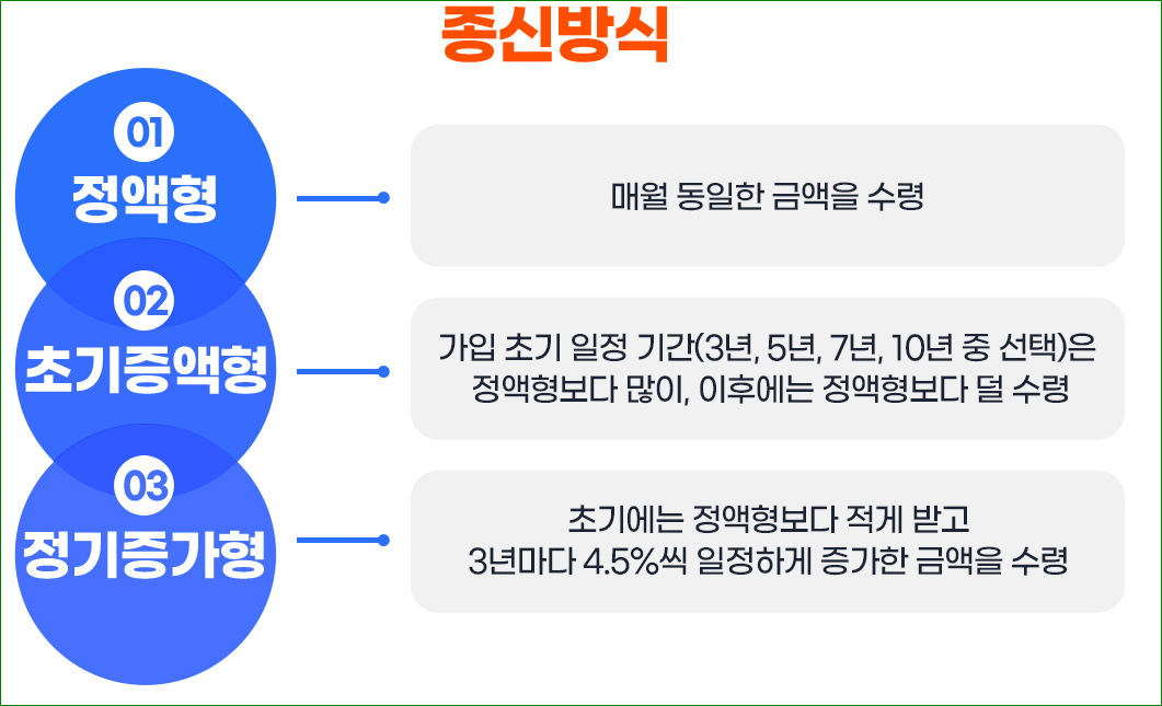 - 종신방식 : 평생 동안 매월 연금방식으로 수령하는 방식입니다.