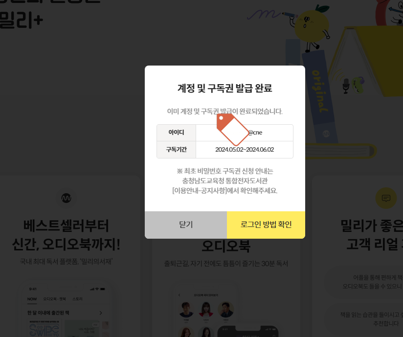 충남교육청 통합전자도서관 밀리의 서재 구독권 신규발급