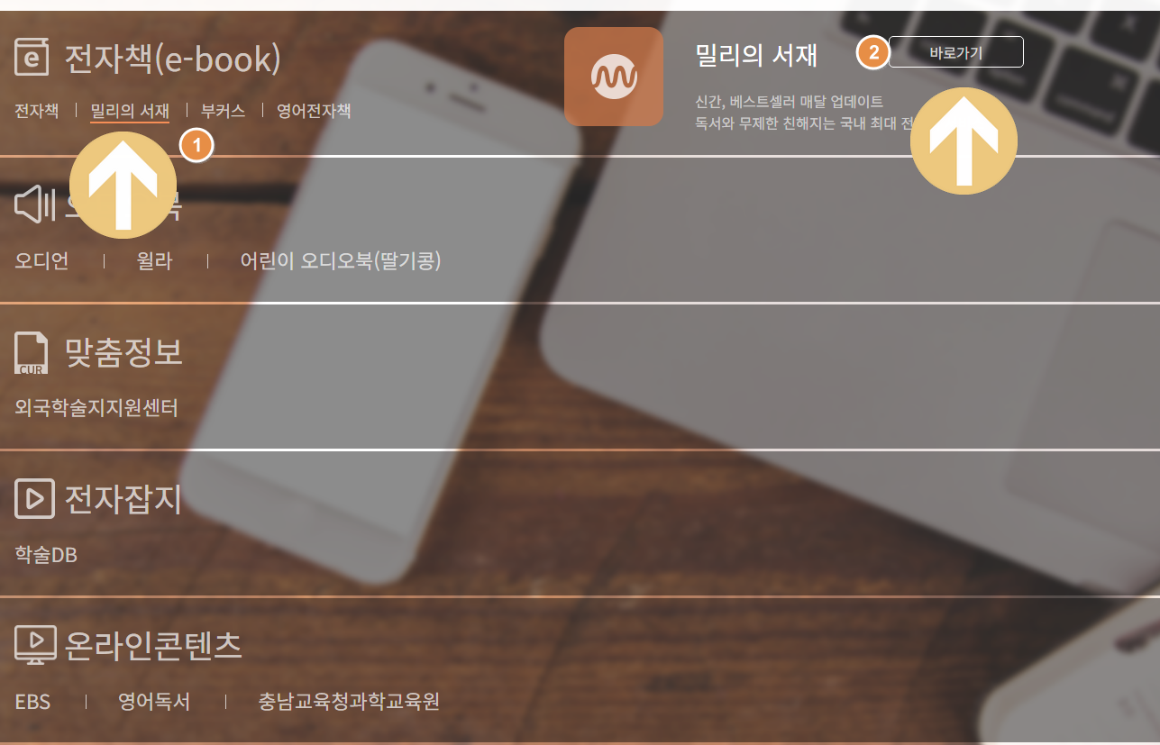 그리고 전자책을 누르면 아래 밀리의 서재 메뉴가 보이지요. 밀리의 서재를 클립하고 옆에 바로가기를 클릭합니다.