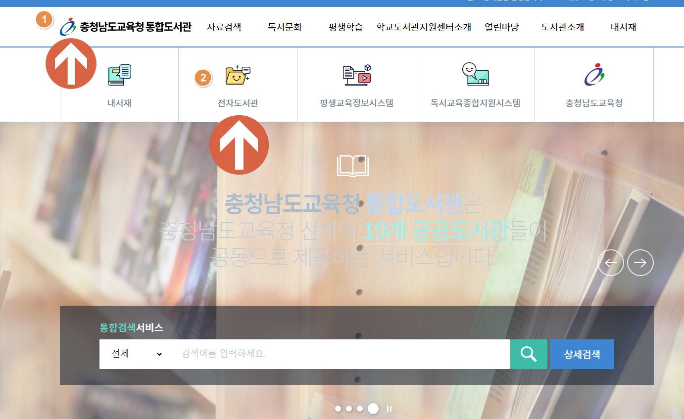 충청남도 교육청 통합도서관으로 가서 로그인 한 후, 전자도서관을 클릭합니다.