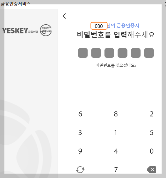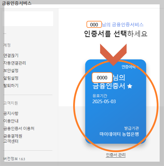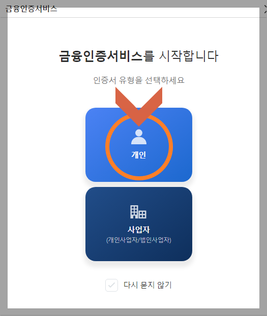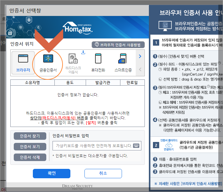 그럼 아래 처럼 인증서 창이 뜹니다. 그 중 금융인증서를 누르세요.