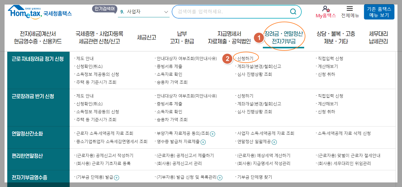 로그인 후, 홈텍스 메뉴 중 장려금,연말정산 부분을 클릭 -> 신청하기를 누르시면 됩니다.