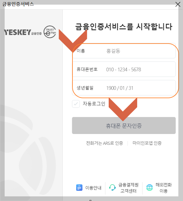 아래처럼 휴대폰 인증을 합니다. 이름, 휴대폰번호, 생년월일을 넣고 문자인증을 하세요.