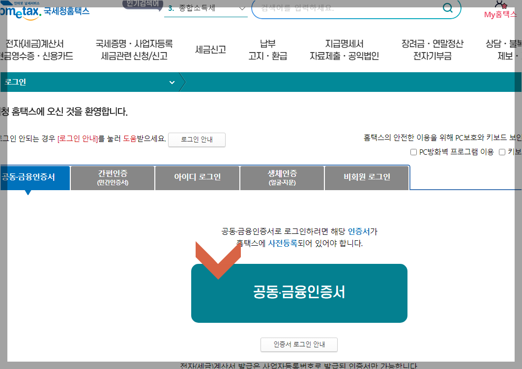 로그인 방법 중 공동 금융인증서로 로그인 하는 방법을 알려드리겠습니다.